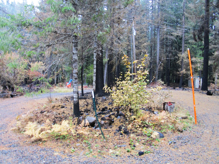View from the driveway of the island between the driveways.
